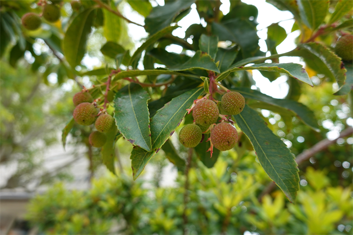 2枚目、住宅展示場で、まだ青いけれど、イチゴノキの実が大きくなってきた。