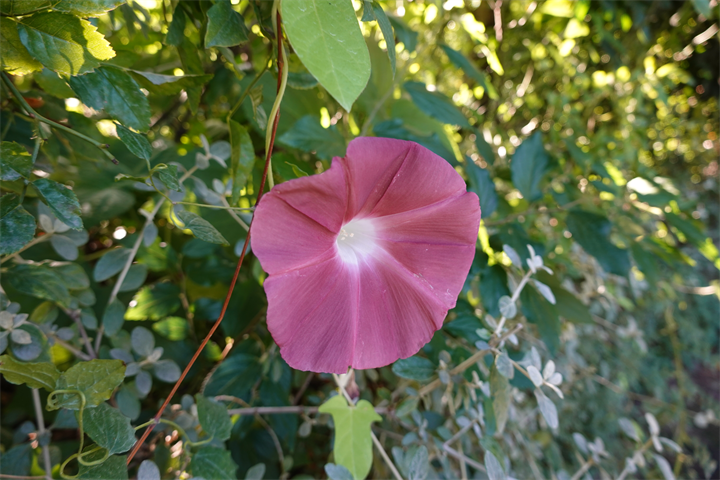 ネットで調べてみると「団十郎は高温に弱く、種が付きにくいことから幻のアサガオと呼ばれている」とある。よく今年の暑さの中で頑張っていること。「家の団十郎が咲いたので日陰に置いて仕事に行き、帰宅したら夜の7時前だったのにまだ咲いていてびっくりした」という記事も見つけた。もしかして、意外と強いのだろうか。