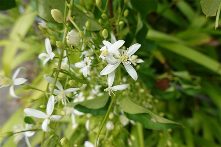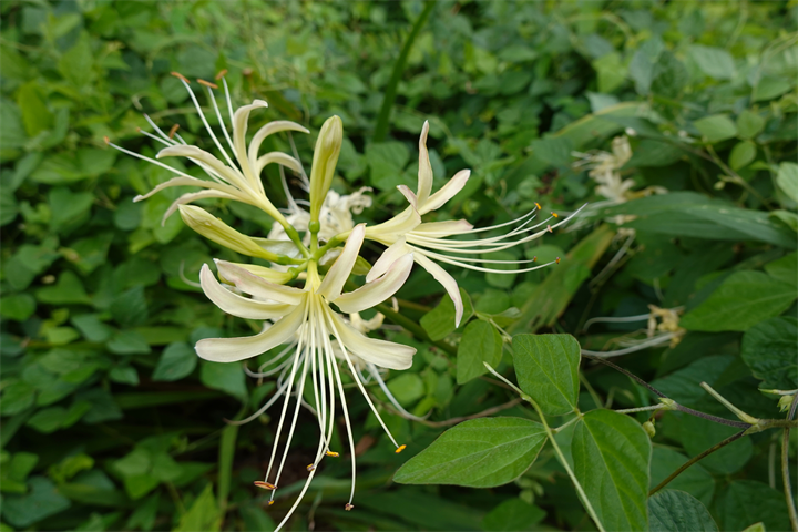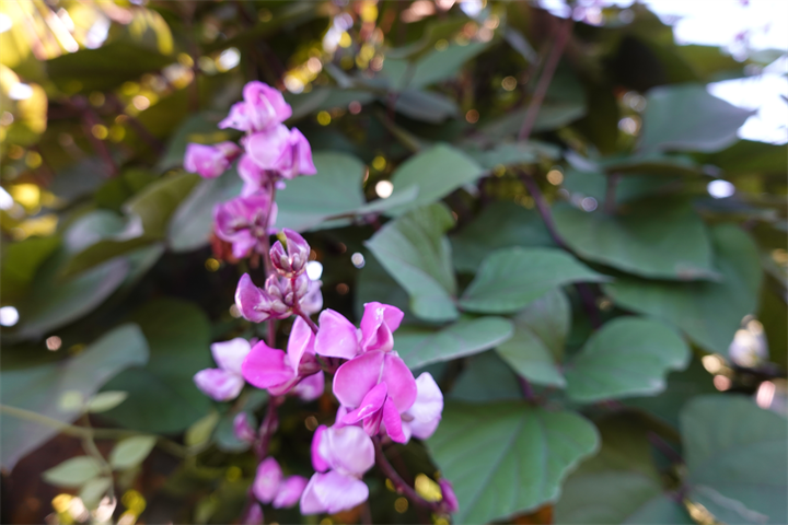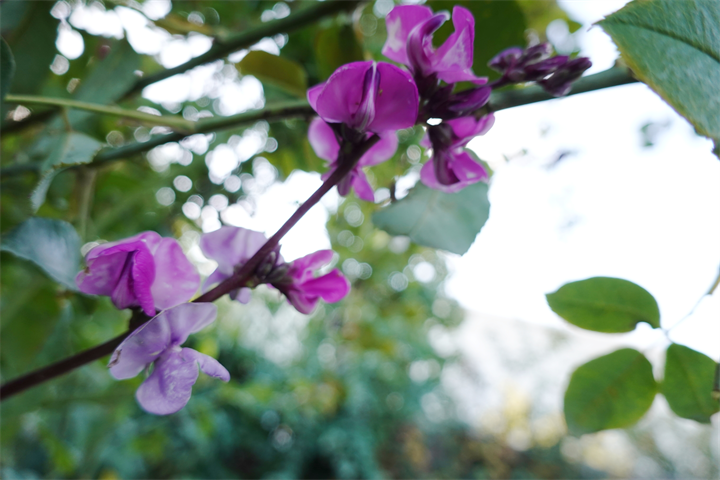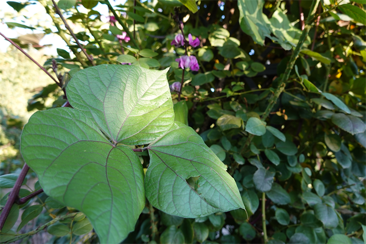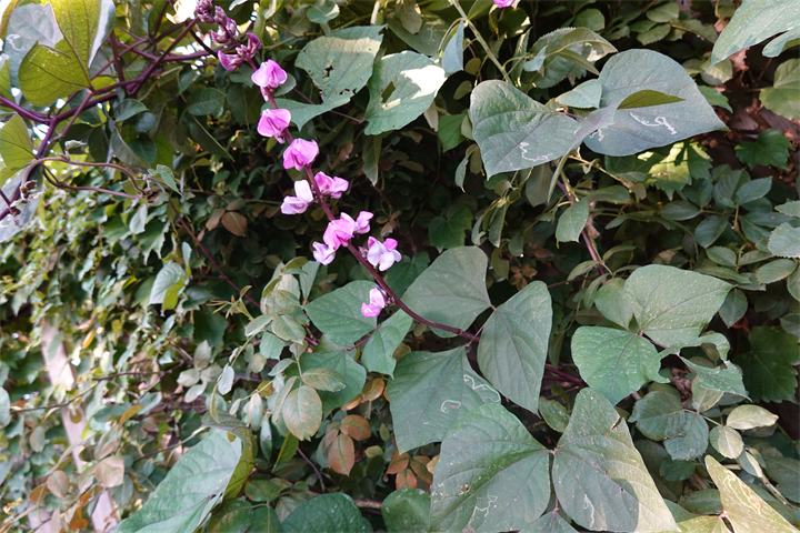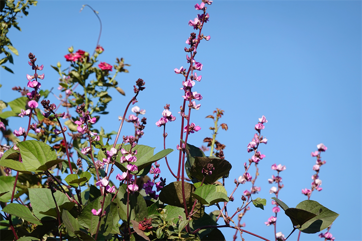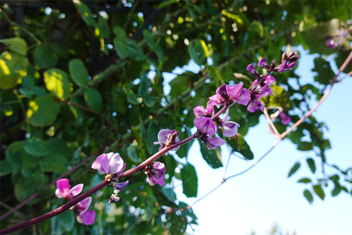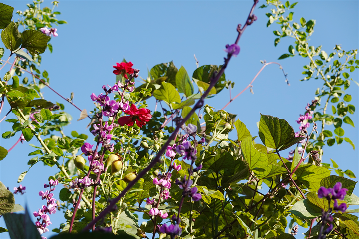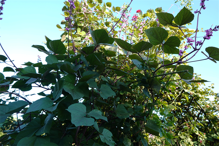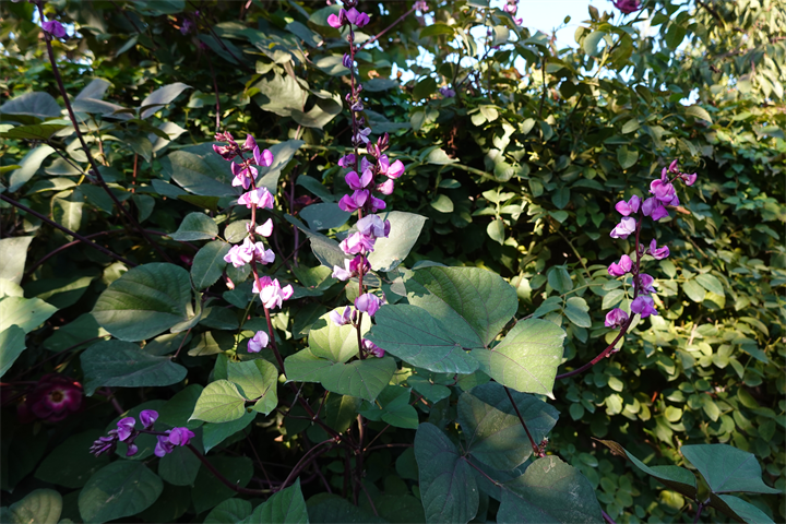 薔薇の木などにも這い上がり、ずいぶんと咲いていたこの花。何だったかなと考えながら写していて、葛(クズ)にも似ているなと思ったけれど、藤豆(フジマメ)。ヒヤシンスビーンとも。白花もあるらしい。