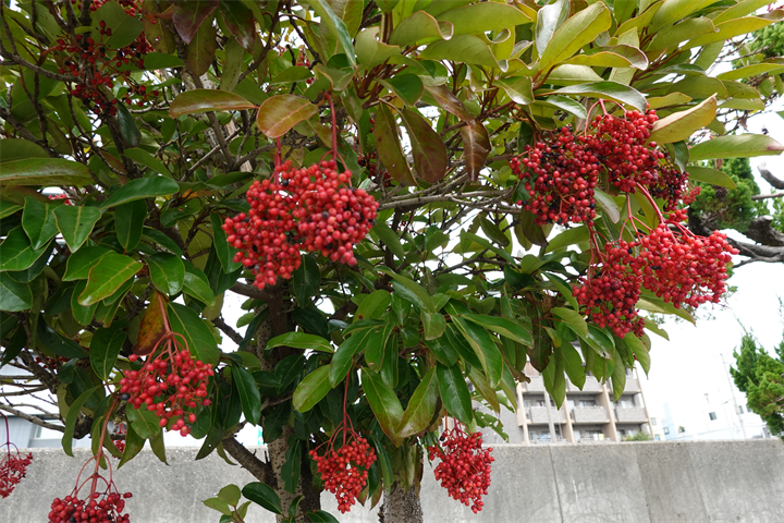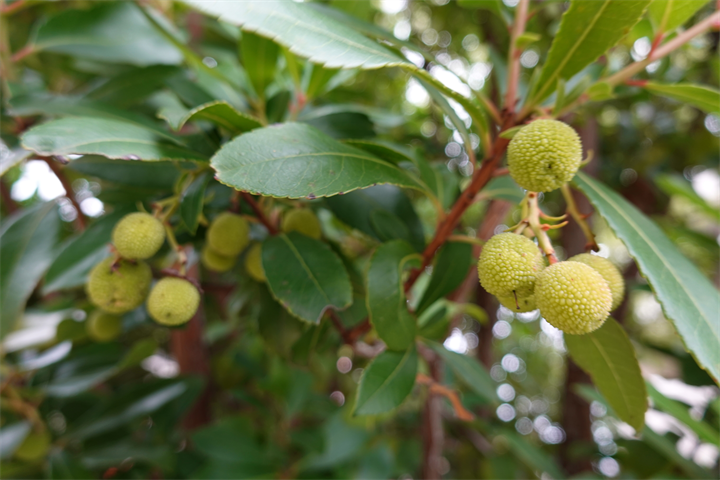 3〜4枚目、住宅展示場のイチゴノキの実はこんなに大きくなり、今後は赤く色づいていく。