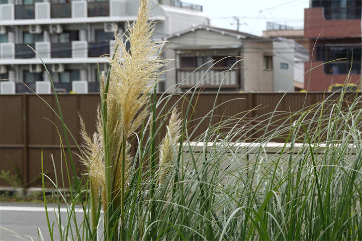 6枚目、近所のパンパスグラス。アルゼンチン原産。巨大ススキのようで、これを見ると秋の気配を感じるけれど、まだまだ猛暑の真っただ中。