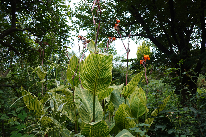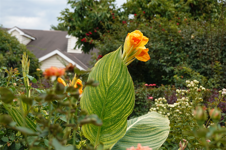 1〜2枚目、斑入りの巨大な葉がきれいなカンナ プレトリア。長く元気に咲き続けている。