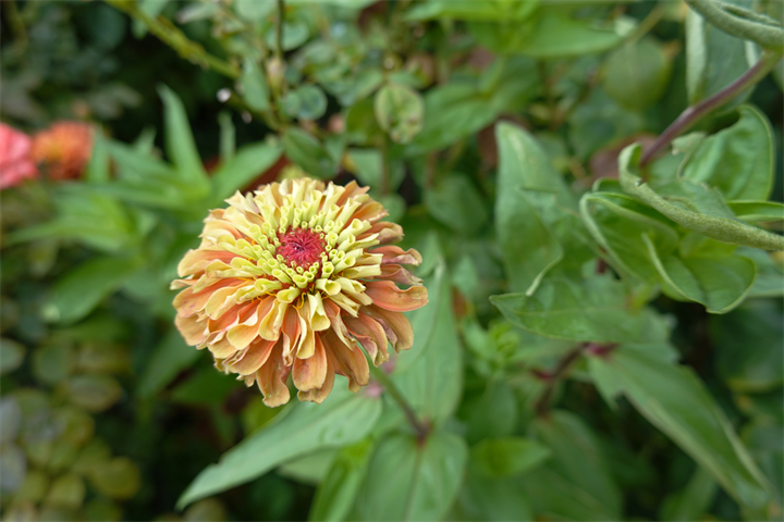 1〜2枚目、百日草(ヒャクニチソウ)。2枚目の写真で、濃いピンク色の花びらが 舌状花。 その中心の黄色い星形に見える小さな花が 筒状花。筒状花の雌しべがピンクの舌状花に落ちている。筒状花を眺めるのは、いつも楽しみ。