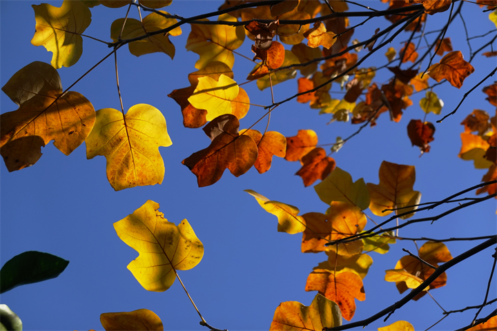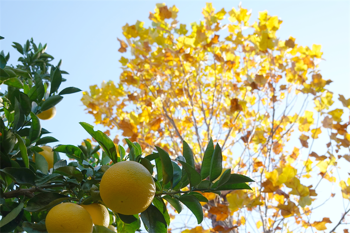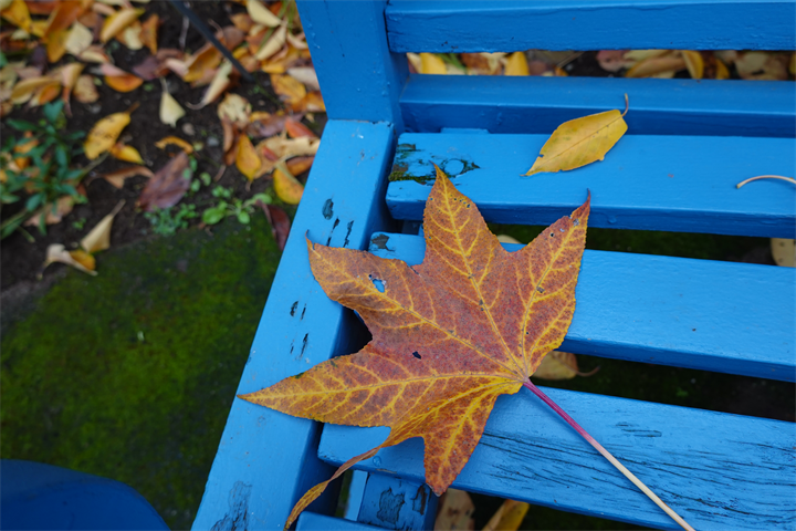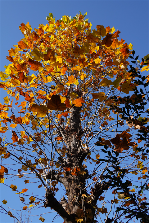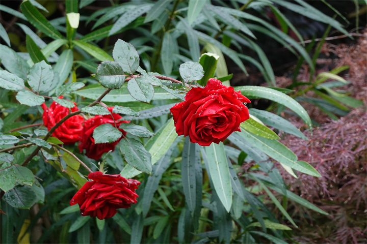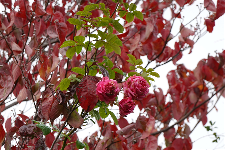 3枚目、紅葉した樹木の手前に、もうじき終わろうとしている、やや傷ついている薔薇。