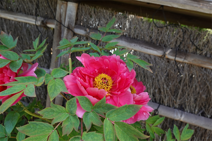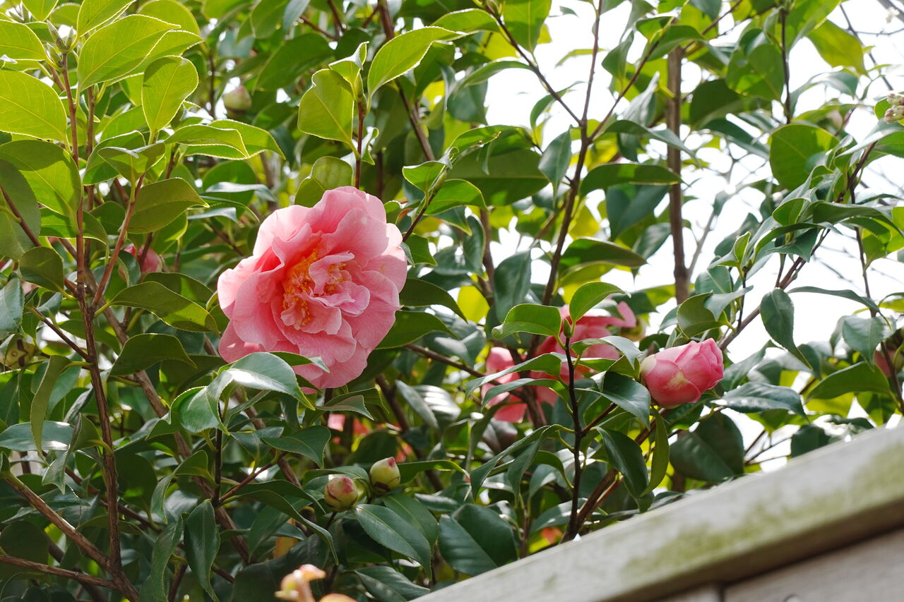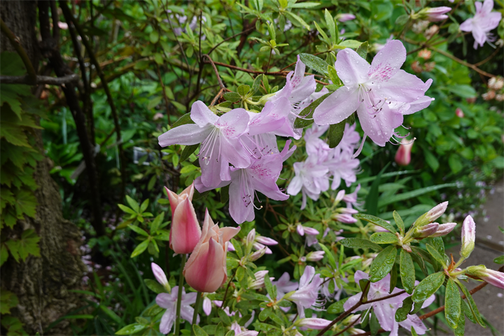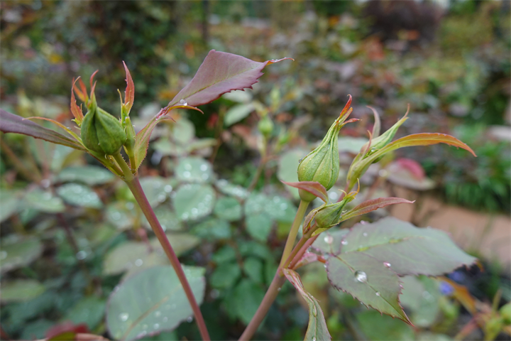 2週間前の写真が1〜2枚目。園内どこにも薔薇は咲いていなかった。1枚目のガゼボの右手に咲いている赤い花は躑躅(ツツジ)。2枚目はいちばん大きそうな薔薇のつぼみを写しておいた。