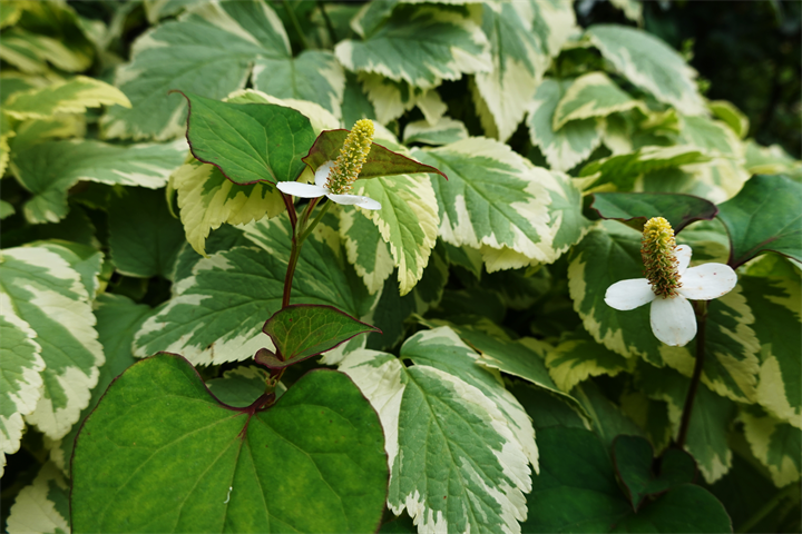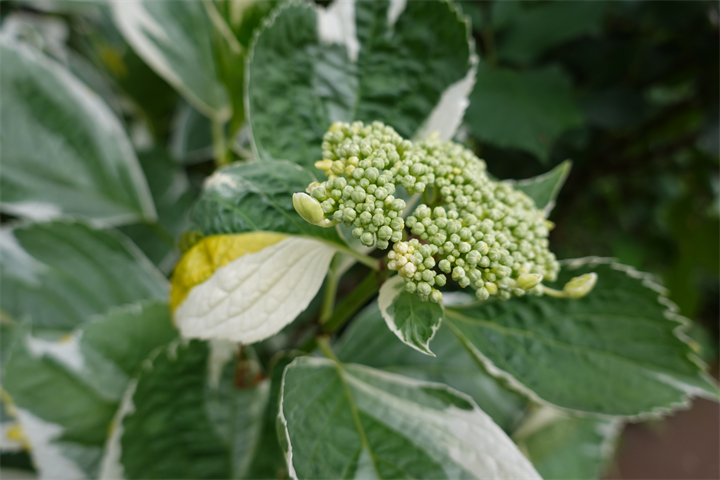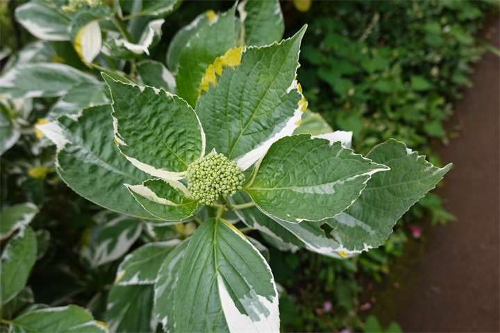 1〜2枚目、黄色い斑入りの葉が珍しい紫陽花、レモンウェーブ。まだ花の咲く前。3〜4枚目は斑入りの葉がみごとな別の紫陽花。