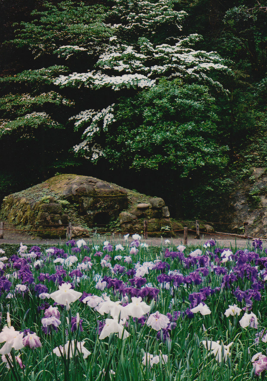 13日の北鎌倉、明月院本堂裏庭園の花菖蒲。正面の山法師(ヤマボウシ)の樹には、白い花がびっしりと咲いていた。実際に見ると、もっともっと綺麗だったのに……。何度も訪れているのに、このとき初めて、山法師と花菖蒲の間のこんもりした石積みのものは何だろうと思った。口もあり、焼き物の窯のようにも見えるけれど、今度、尋ねてみよう……。