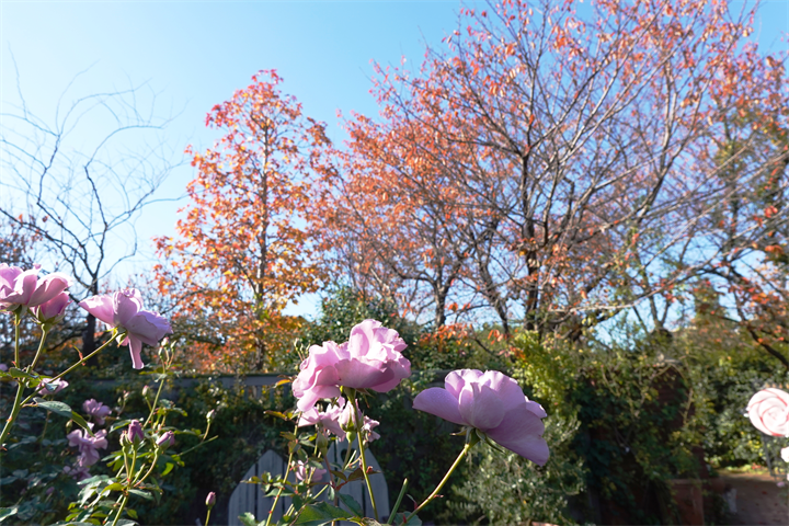 園内で朱色に色付いた木々と薔薇。