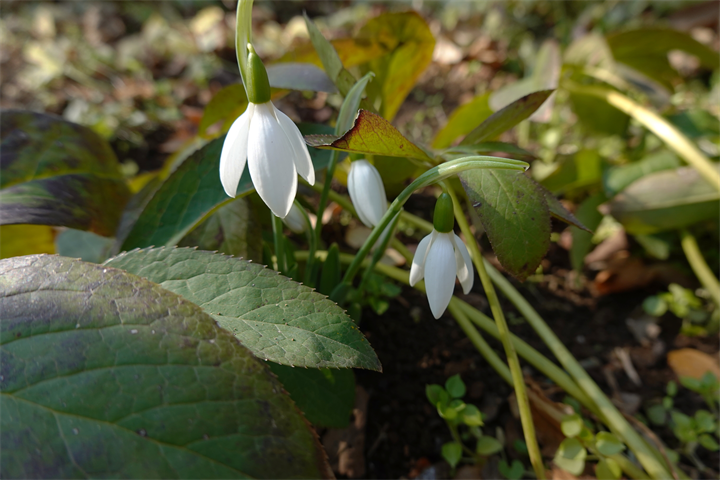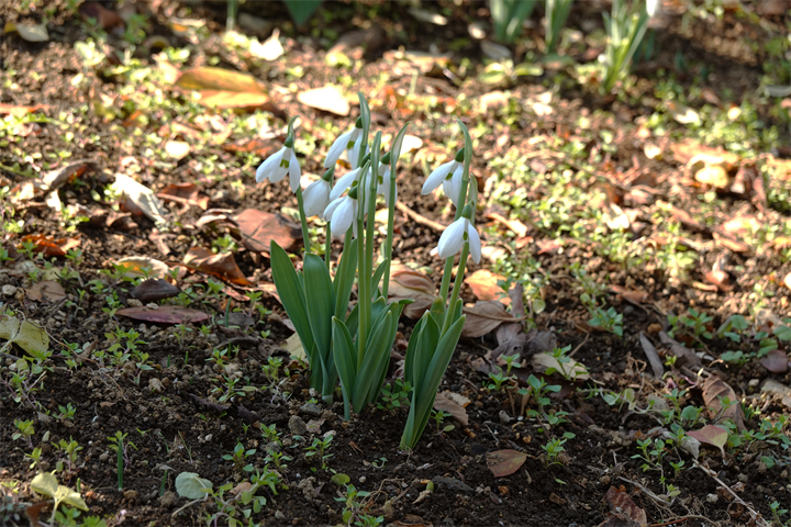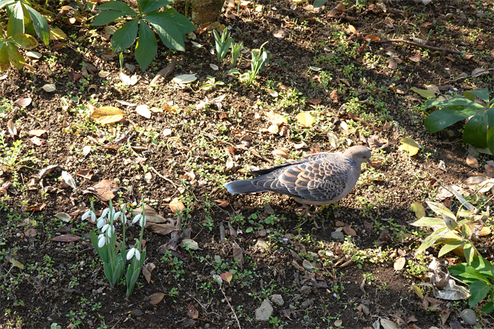 3〜6枚目、まだ花が少ないスノードロップの間を鳩が散歩中。