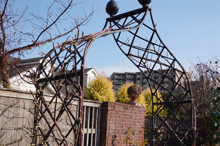 1枚目、蔓薔薇で彩られるアーチも、今はまだ茎だけで寒々としている。