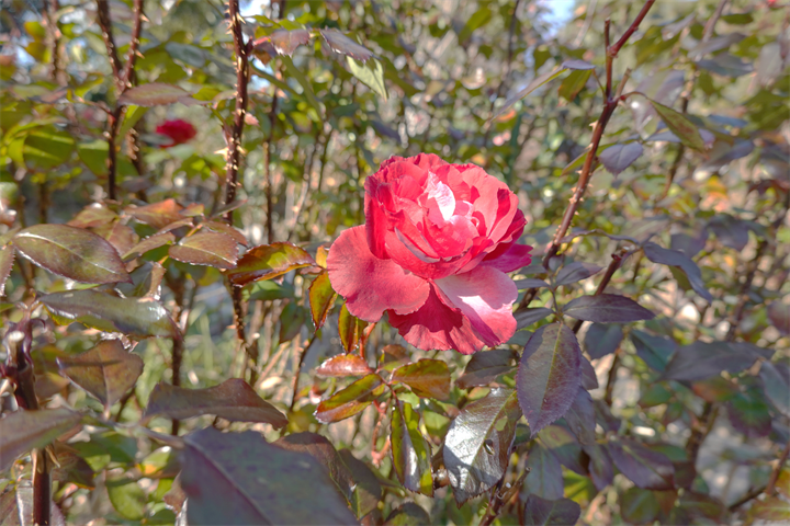イングリッシュガーデンでは冬というのに、ガゼボ近くの真っ赤な薔薇がとてもきれい。ここだけ燃えているよう。いつまで咲いていてくれるだろう。