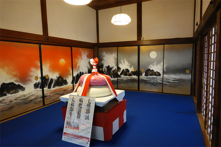 5枚目から、大玄関を入ってすぐの正面に見える浜田泰介氏の襖絵。圧倒される美しさ。その前の生け花もみごと。