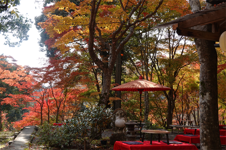 3枚目の看板のところから入り、4〜8枚目、紅葉に染まった広いお庭でゆっくりと昼食を戴いた。この狸の横に立っているキャラクターは、佛教大学のキャラクター選挙で選ばれた高雄のマスコット「高雄もみじちゃん」。あちこちで目にした。